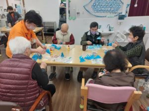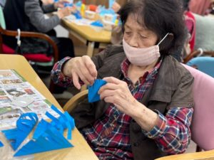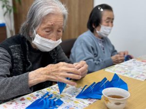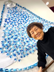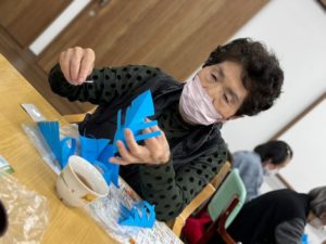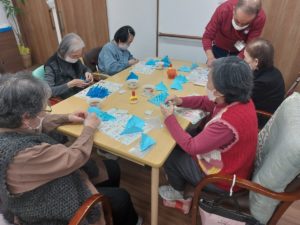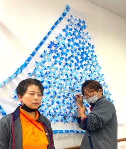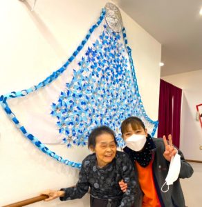 ※利用者様とスタッフで作った青とシルバーのポインセチアを壁面に散りばめていきます。