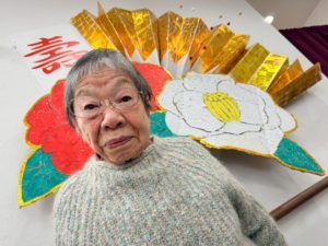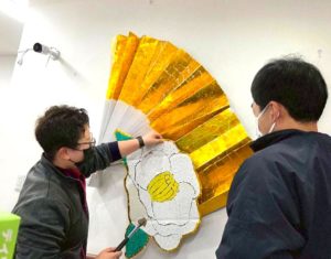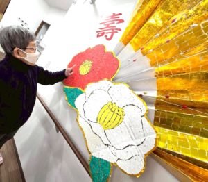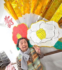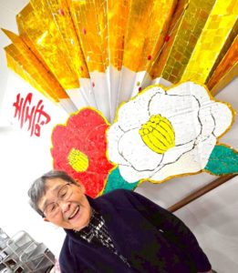 お正月らしくめでたい雰囲気にするため大きな金の扇を作りました。