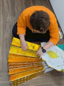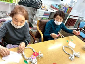 壁画の前に飾るオーナメントはこちらも新年らしくしめ縄をみんなで作りました